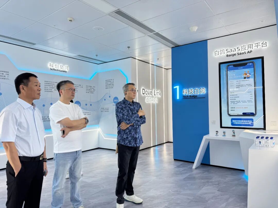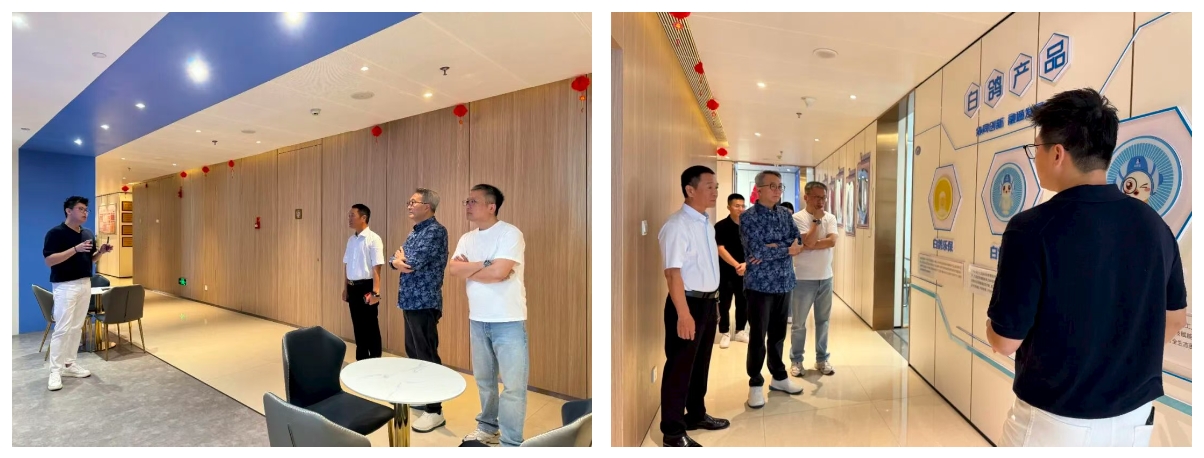 刘绪铭一行参观了白鸽在线AI展厅及企业总部,全面了解其数字化实践成果。柯葳彬详细介绍了白鸽在线通过“9+N”生态应用场景赋能政企数字化转型的案例,重点分享了在虚拟资产交易、支付清算、零散用工等场景的风险管理解决方案。
