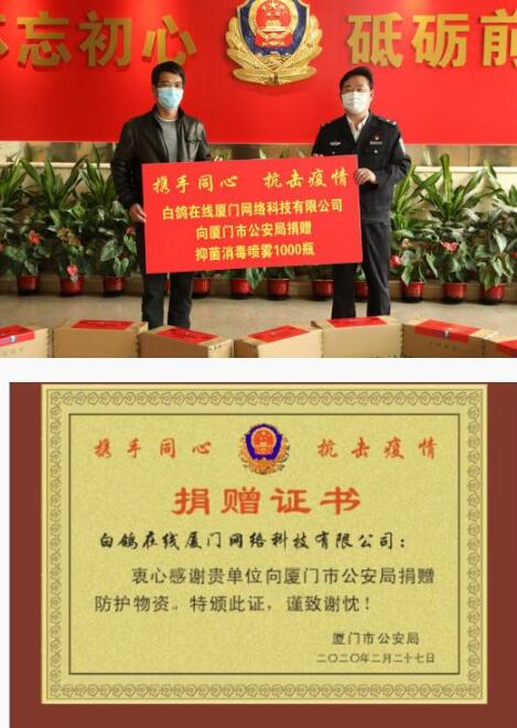 2月27日,白鸽在线向厦门市公安局捐赠1000瓶抑菌消毒喷雾,价值3.9万元。疫情发生以来厦门市公安局的警务人员便跻身于防疫一线的奋战中,高强度高风险的作业环境让警务人员的身心都面临着隐患。白鸽在线董事长涂锦波特代表全体员工向人民英雄致敬,并贡献出自己的一份绵薄之力为人民英雄的安全温暖护航。