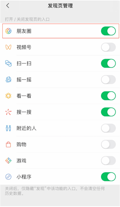 (设置-通用-发现页管理-关闭朋友圈入口)